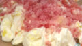 6. 茹で汁をザルでこし、300mLをボウルに取り、しょう油、酢、砂糖を加えてめんつゆを作り、氷水で冷やします。