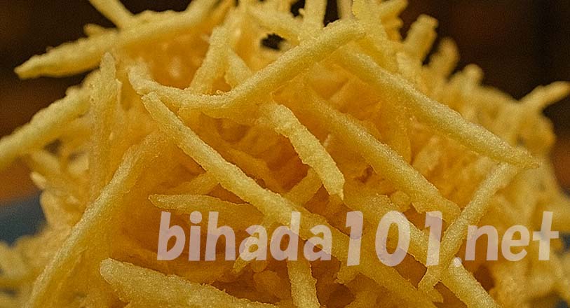 - 薄く広げて形を整え、180度の油で約2分揚げます。