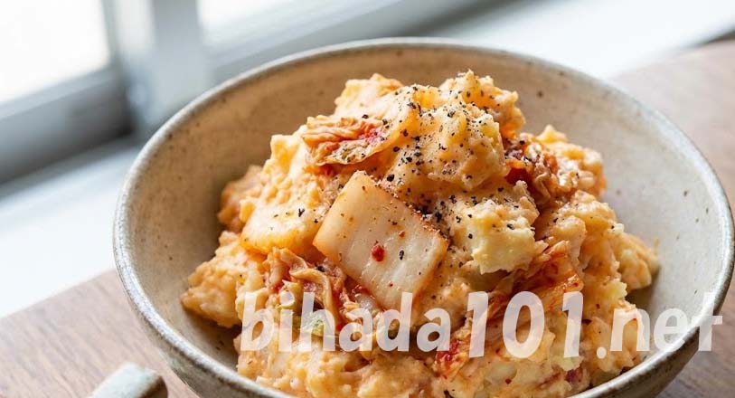 3. 加熱したじゃがいもをマッシャーで丁寧に潰します。そこに1で作った白菜キムチとマヨネーズを加え、全体をよく混ぜ合わせます。