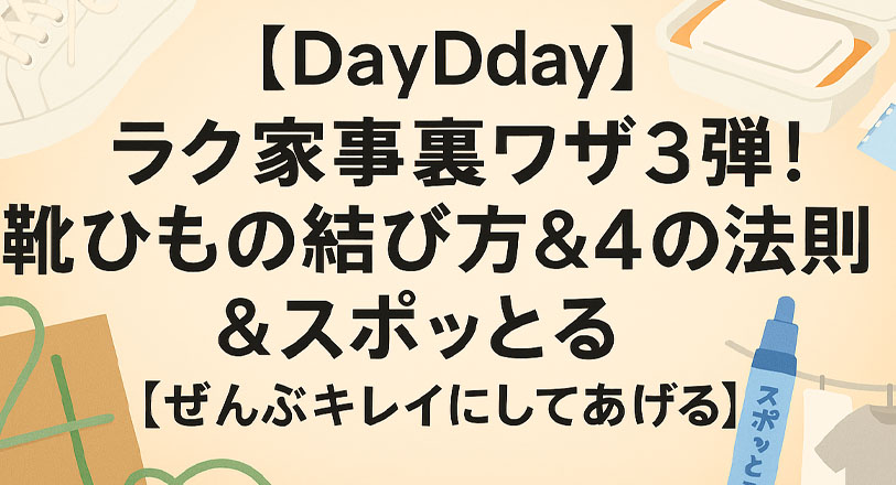 2025年9月29日放送のDayDayのドラマで学べる役立つライフハックではラク家事裏ワザ3弾を紹介していました。ほどけづらい靴ひもの結び方や4の法則、シミ抜きのスポッとるなどを紹介していました。