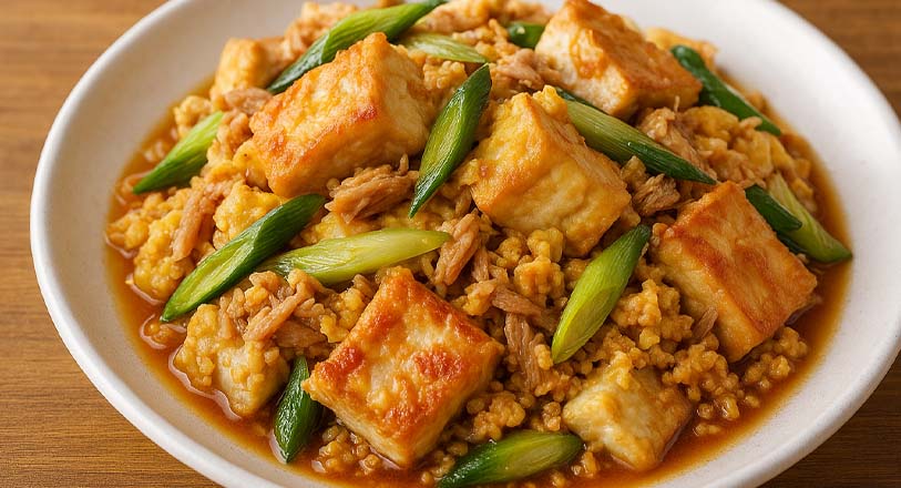 豆腐のふわふわ感とツナや天かすのうま味、豆板醤のピリ辛さが絶妙にマッチした一品です。手軽に作れるのにボリューム満点で、ご飯のおかずにもおつまみにもぴったり!炒めるだけなので時短で作れるのも魅力です。
