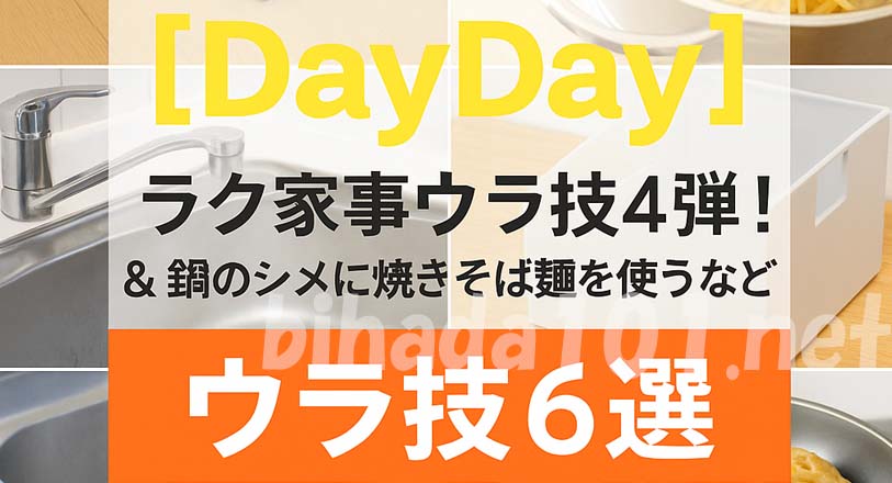 2025年10月27日放送のDayDayのドラマで学べる役立つライフハックではラク家事裏ワザ4弾!玄関のほこり&鍋のシメに焼きそば麺を使うなど裏技6選を紹介していました。