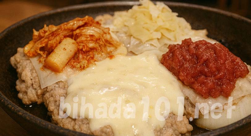 4. 上にカレー粉、シュレッドチーズ、キムチ、梅干しをそれぞれトッピングして再度蒸し焼きにします。水分が残っていたら1〜2分追加加熱して仕上げます。