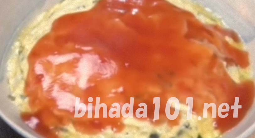 5. レンジから取り出したカニ玉の上に、熱々の甘酢あんをたっぷりとかければ完成です。