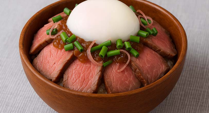 - ご飯を器に盛り、ローストビーフを薄くスライスしてのせ、温泉卵をトッピングしたら完成です。