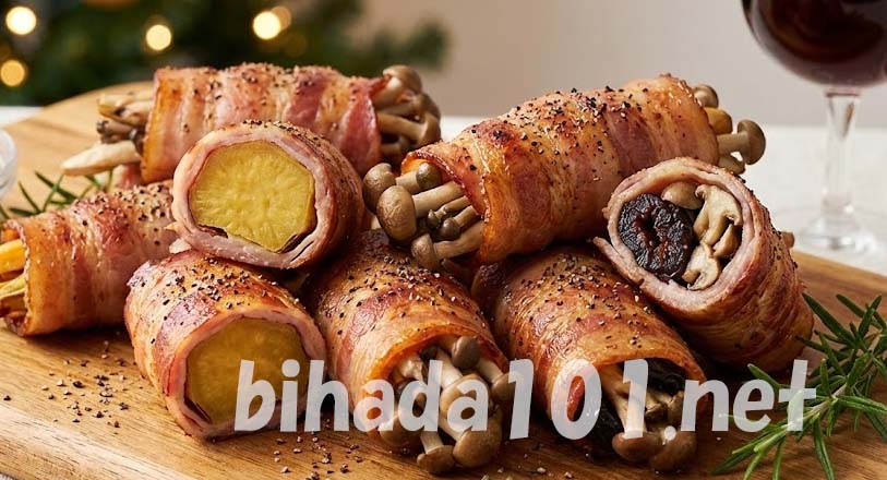 - ベーコン(6枚)を用意し、その上に1で準備した干し芋としめじを適量のせて、端からくるくると巻いていきます。