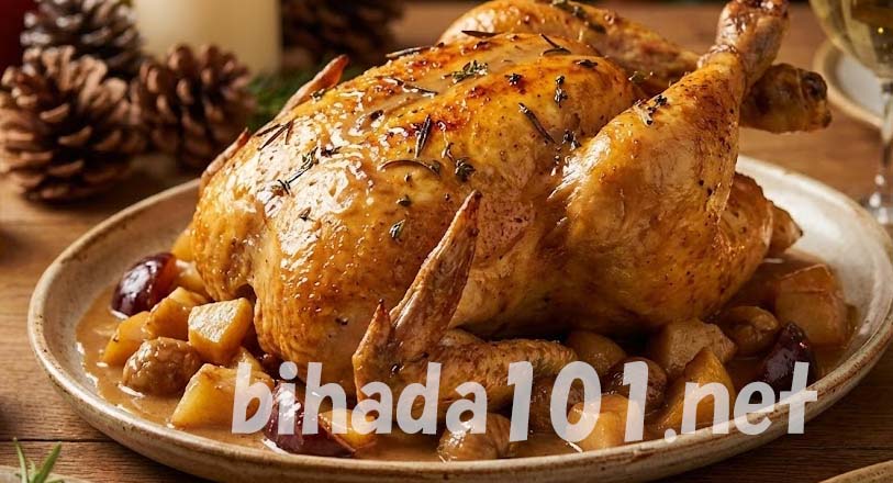 - 焼き上がったら、丸鶏を取り出してお皿に盛り付けます。