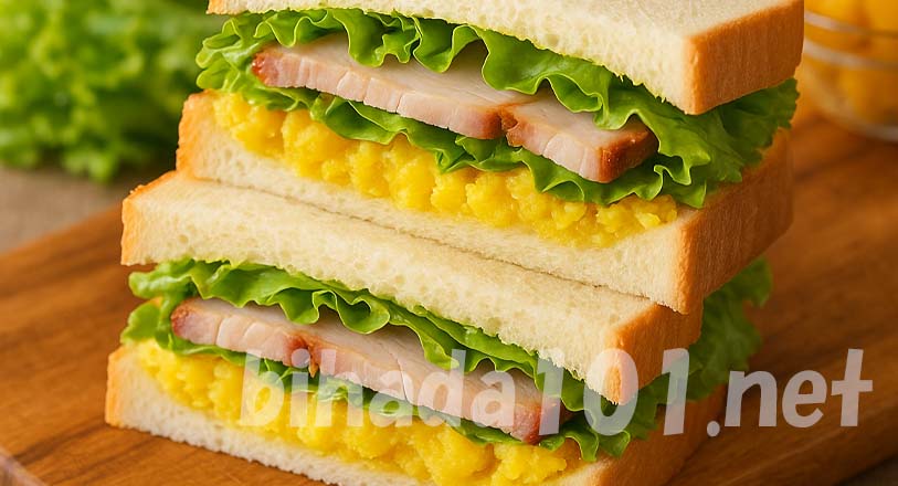 甘みのあるさつまいもと塩気のきいた焼豚のバランスが絶妙で、朝食にもぴったりの一品でした。さつまいものほくほく感とレタスのシャキシャキ感が心地よく、バターの香りが全体をまとめています。見た目もボリューム満点で、冷めてもおいしいサンドイッチです。
