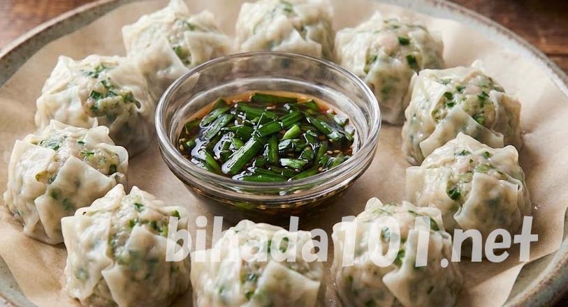 6. 加熱が終わったら中央のにらが入ったボウルを取り出し、そこにポン酢とごま油を加えて混ぜ、特製だれを作ります。シューマイにつけてお召し上がりください。