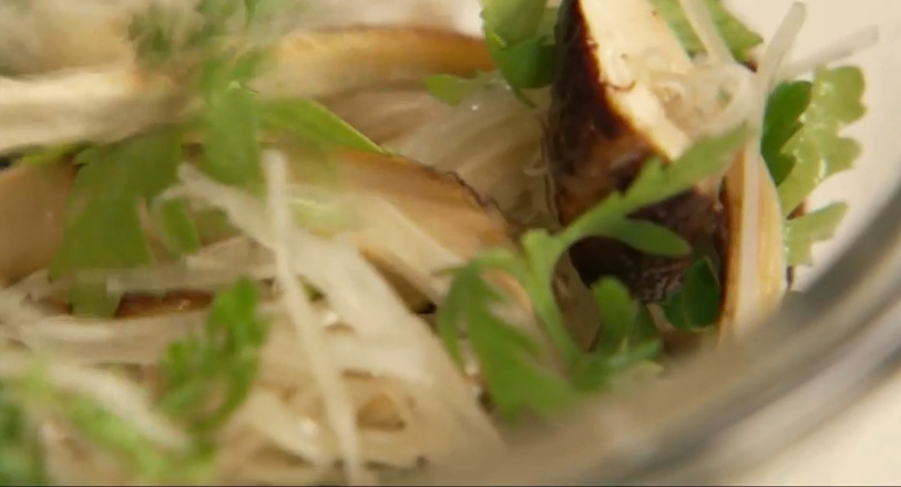 - ボウルに蒸し焼きにした松茸と大根を入れ、しょうゆとかぼす果汁を加えてやさしく和えます。
