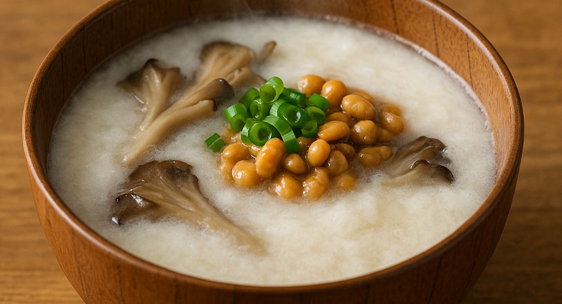 とろろのふんわりとした口当たりとまいたけの香りが絶妙に合わさり、栄養たっぷりで体に優しい一品でした。納豆と細ねぎを加えることで風味も豊かになり、満足感があるのに軽やかにいただけます。肌寒い季節にぴったりの健康スープです。