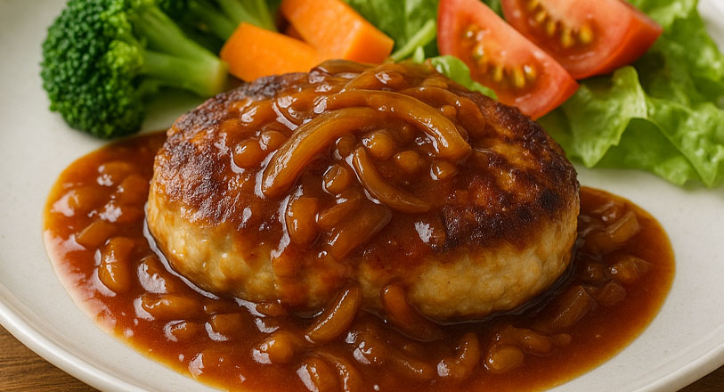 豆腐を加えることで、ふんわりと軽い食感のハンバーグになっていました。玉ねぎの甘みとソースのコクがしっかりと絡み、満足感のある味わいです。ごはんにもよく合う一品です。