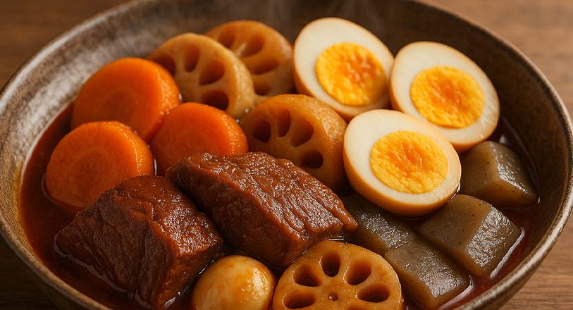 牛肉の旨みが根菜とこんにゃくにじっくり染み込み、コチュジャンのピリ辛とコクが全体を引き締めています。ゆで卵にも味がよくしみて、ごはんが進む一品です。ボリューム感があるので、おもてなしにもぴったりの煮物です。