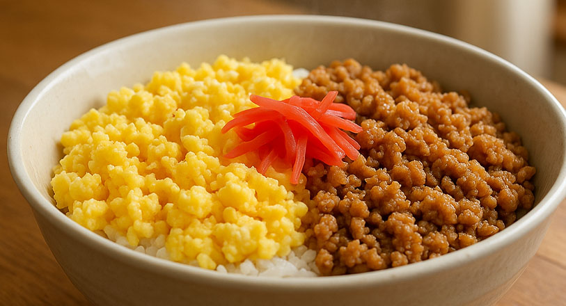 ふわふわの卵そぼろと甘辛い鶏そぼろのバランスが絶妙で、ご飯が進む味わいです。手順もシンプルで、15分ほどで作れるので忙しい日のランチや夕食にもぴったりです。