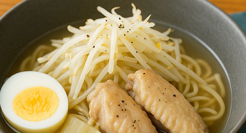 - 器に麺を入れ、スープと大根を加え、手羽先をのせます。もやしをトッピングし、黒こしょうを振って完成です。