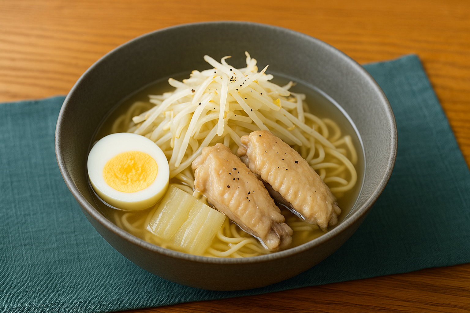 - 器に麺を入れ、スープと大根を加え、手羽先をのせます。もやしをトッピングし、黒こしょうを振って完成です。