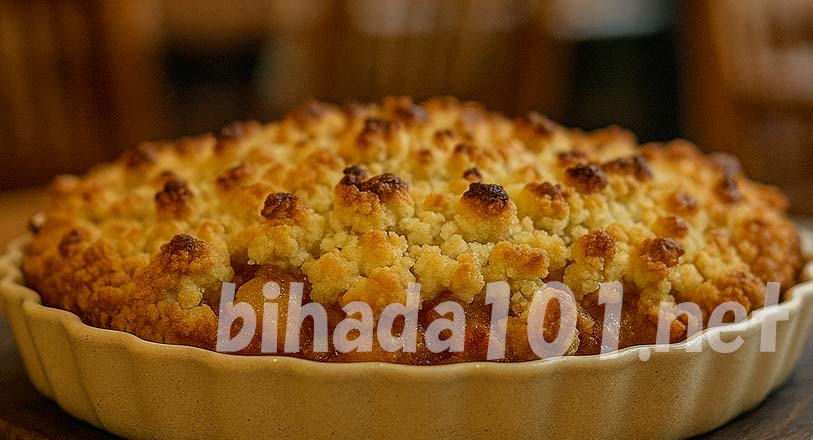 - 焼き色がついたら耐熱容器に移し、上からクランブル生地を均一にのせます。