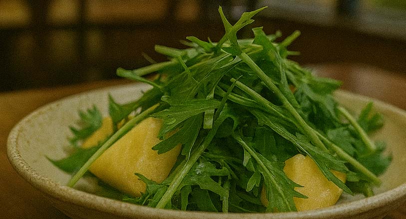 柿のやさしい甘みと春菊のほろ苦さが驚くほど相性よく、シンプルながら奥行きのある味わいのサラダでした。酢とオリーブオイルのドレッシングが素材を引き立て、食卓の箸休めにもぴったり。季節感も楽しめる爽やかな一品です。