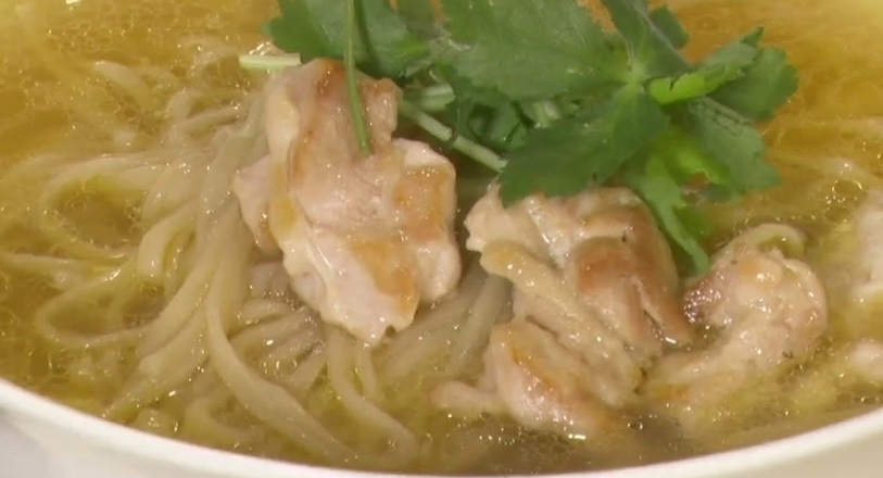 - 鶏スープを注ぎ、鶏もも肉をのせたら完成です。