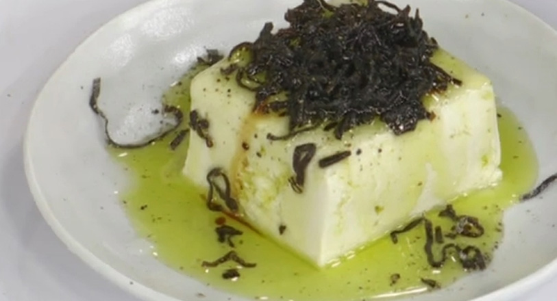 - 水気を切った木綿豆腐(150g)をお皿に盛り付け、その上にみじん切りにした塩昆布をのせます。
