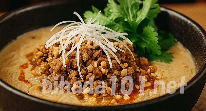 - 上に肉味噌、白髪ネギ、刻んだパクチーをのせ、ラー油を回しかけて砕いたピーナッツを散らして完成です。