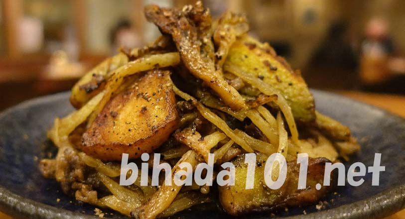 ねっとり甘いきみまろこに、バルサミコ酢の酸味とマスタードのコクが加わって、甘じょっぱくて奥深い味わいでした。豚肉とまいたけの旨みも合わさり、ごはんにもお酒にも合う一品だと感じました。