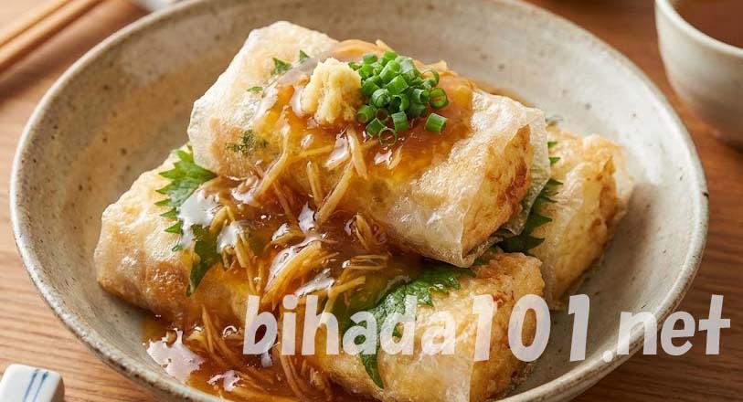 ライスペーパーを衣に使うというアイデアが秀逸です!外側はパリッ、モチッとした食感で、中からはたま豆腐特有の濃厚でとろけるような口当たりが楽しめます。たっぷりのしょうがあんが体の中から温めてくれる、寒い日にぴったりの上品な揚げ出し豆腐ですね。大葉の爽やかな香りも良いアクセントになっています。