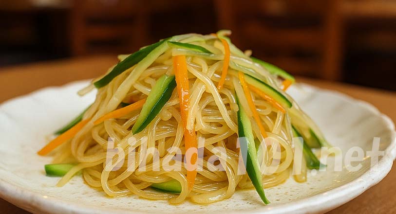 2. 春雨を別の鍋で茹で、やわらかくなったら湯を切ります。