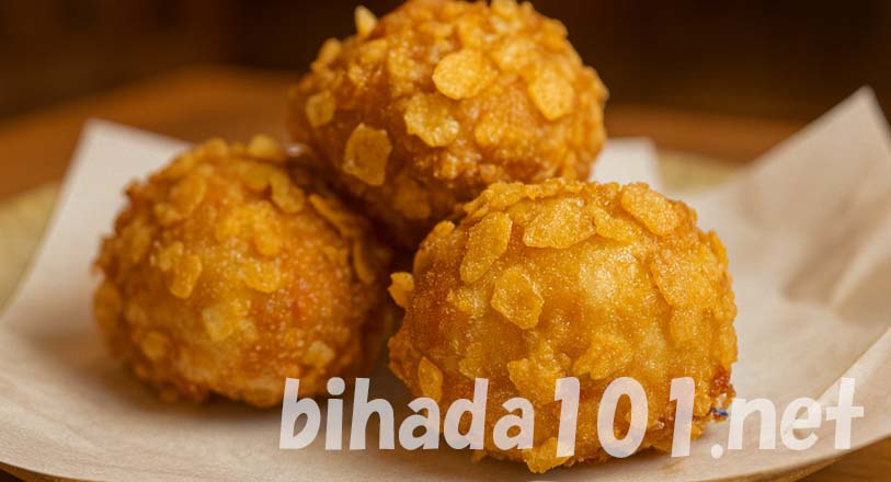 4. 丸めたタネにコーンフレークをしっかりまぶします。