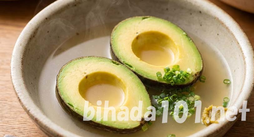 3. 出汁の中にアボカドを入れます。このとき、グツグツと煮込まずに弱火で温めるのがポイントです。