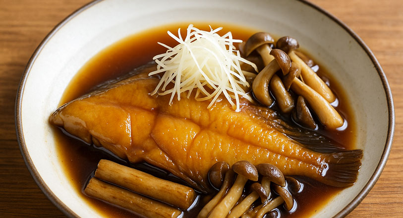 カレイの身はふっくらとやわらかく、甘辛い煮汁がしっかりと染み込んでご飯との相性も抜群です。ごぼうやきのこの旨味も加わり、上品で味わい深い一品に仕上がります。