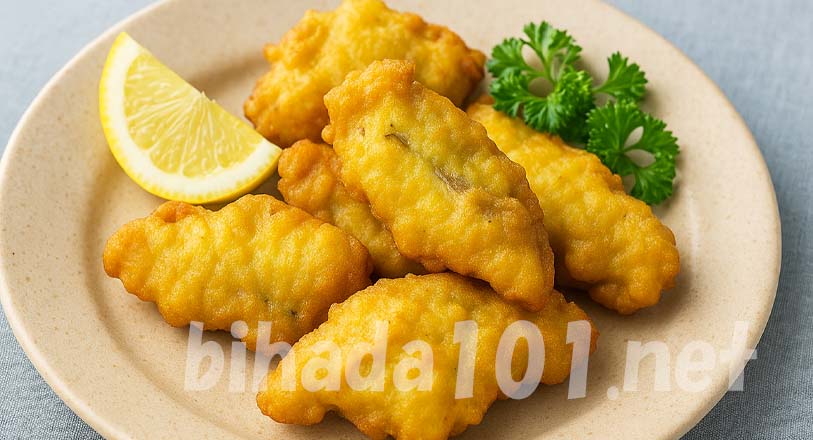 - ①に打ち粉を軽く振り、③の衣をつけて170〜180℃の油で2〜3分、衣がカリッとするまで揚げます。