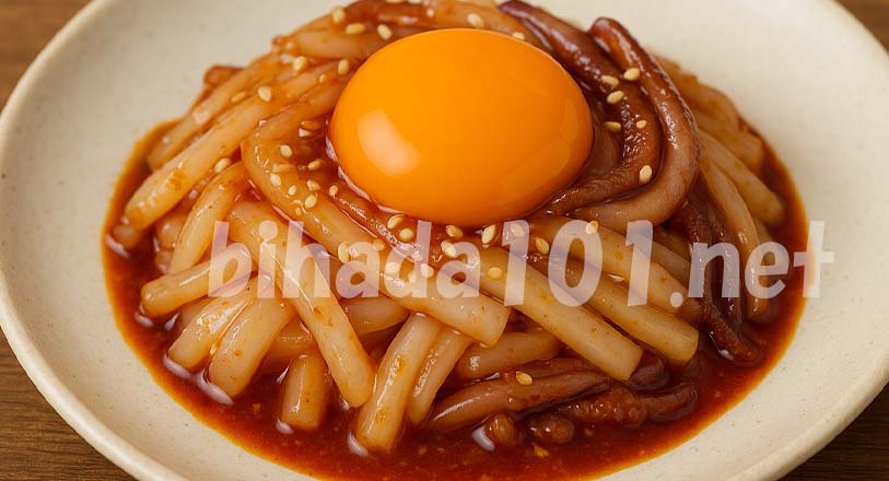 - いかの中央に卵黄をのせ、ユッケダレをかけて完成です。