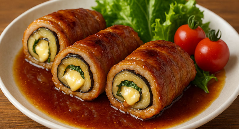 ナスとチーズ、青ジソ、豚バラ肉の相性が抜群で、タレがしっかり絡んでごはんが進む一品です。巻いて焼くだけで見た目も華やかなので、お弁当のおかずにもぴったりです。
