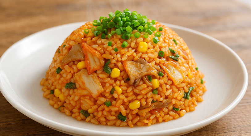 キムチと焼き肉のタレの組み合わせで食欲をそそる香りが広がり、しっかりとした味わいのチャーハンに仕上がります。コーンの甘みとネギの香りがアクセントになり、食べ応えも抜群です。短時間で作れるのでランチや夕食にぴったりの一品です。