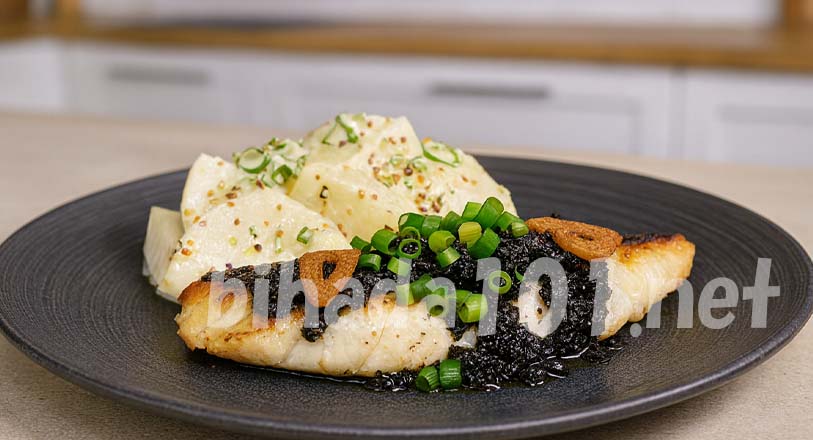 - 器に鯛を盛り、上からのりバターソースをかけ、万能ネギと③のニンニクを散らします。粗びきコショウをふり、①のカブを添えて完成です。