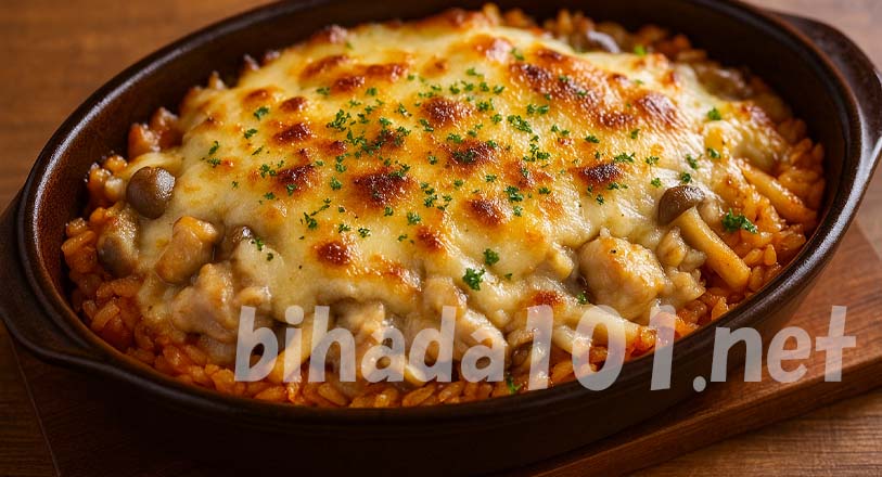 濃厚なホワイトソースに、ケチャップライスの甘酸っぱさが絶妙にマッチ。鶏肉ときのこのうま味が重なり、シンプルながら奥深い味わいでした。仕上げに散らしたパン粉の香ばしさもアクセントになり、レストランの味を家庭で手軽に再現できます。