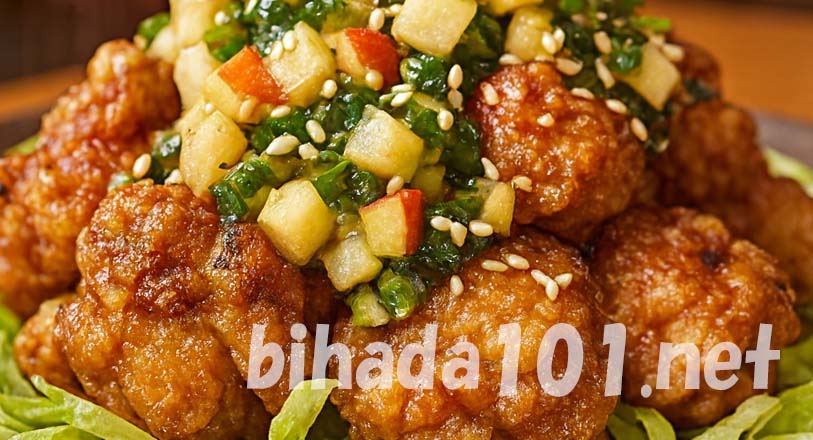 レモンとリンゴの爽やかな香りがから揚げに驚くほどよく合い、重たくなりがちな揚げ物がとても軽やかに楽しめる一品でした。二度揚げすることで外はカリッと、中はジューシーな仕上がりに。シャキシャキのレタスと甘酸っぱいソースが絶妙で、食卓が華やぐ大満足のレシピです。