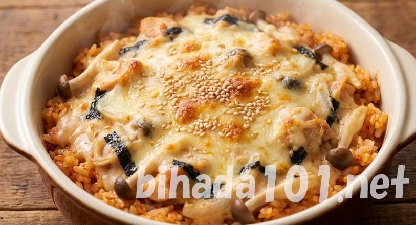 1. ボウルにご飯、キムチ、バター(10g)、黒コショウを入れて混ぜ合わせ、耐熱容器につめます。