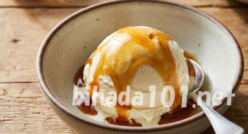 - 最後に、煮立たせた本みりんをバニラアイスに適量かけたら完成です。