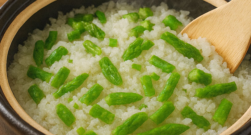 アスパラガスのシャキッとした食感と香りがご飯にしっかり染み込み、やさしい塩こうじのうま味と料理酒の風味が広がるシンプルながら奥深い味わいです。土鍋で炊くことでふっくらとした仕上がりになり、旬の野菜を楽しめる炊き込みご飯でした。