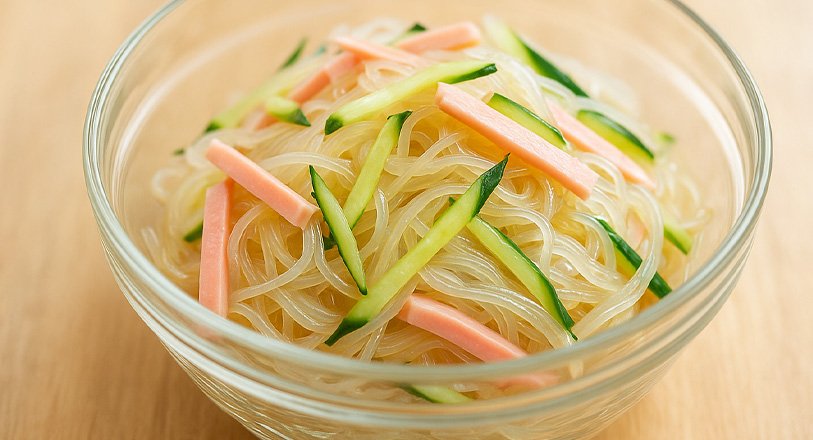 - ボウルに春雨、ハム、きゅうりを入れ、砂糖・お酢・ごま油・鶏ガラスープの素を加えてよく和えます。
