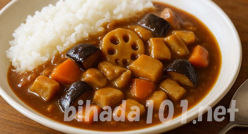 和風だしのまろやかな旨みがカレーのスパイスを引き立て、優しい味わいの一皿です。豚肉のコクと根菜の甘みがしっかり感じられ、食べ応えも抜群。ナスのとろっとした食感もアクセントになっています。お子さんから大人まで楽しめる、ほっとするカレーです。