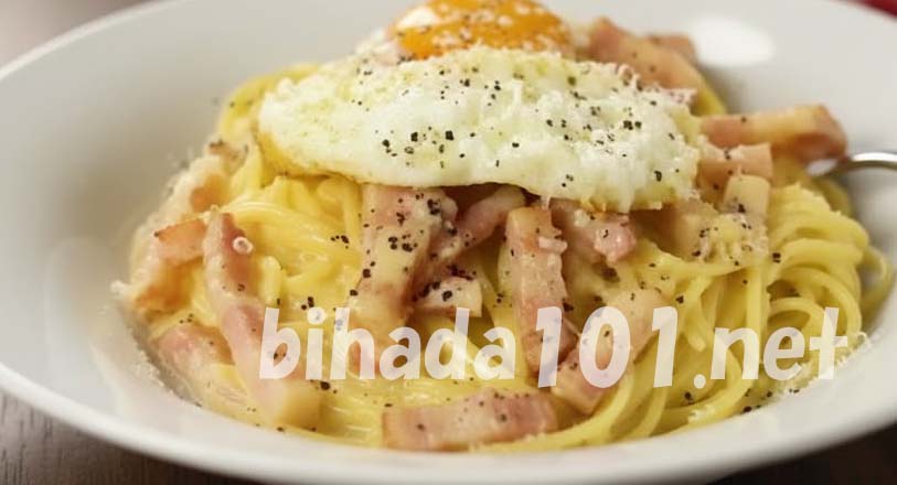 - 茹で上がったパスタを水切りし、ベーコンのフライパンに入れて中強火で炒め、火を止めます。