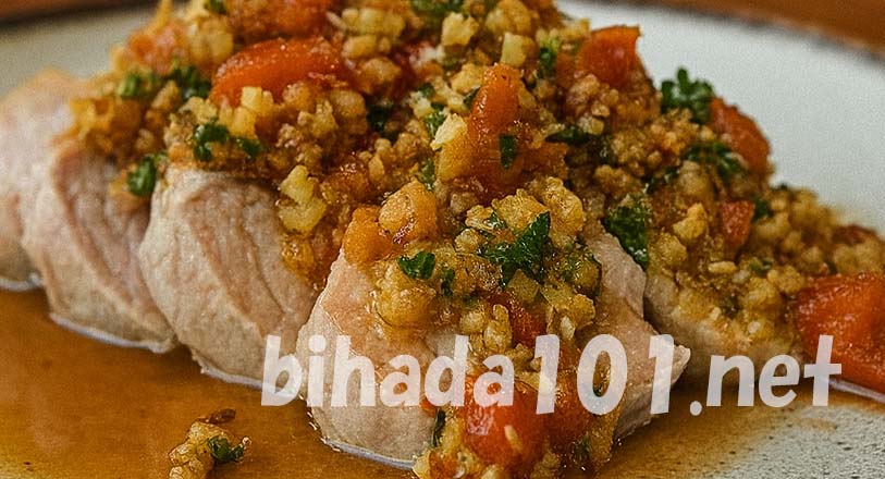 - 茹で上がった豚ヒレ肉は1.5センチの厚さに切って皿に盛り付けます。