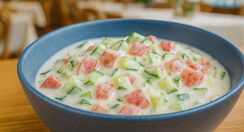 2025年12月14日放送のぺこもぐキッチンの竹財輝之助のぺこぺこを叶える!イケオジグルメ対決では、インド風サラダのライタを紹介していました。