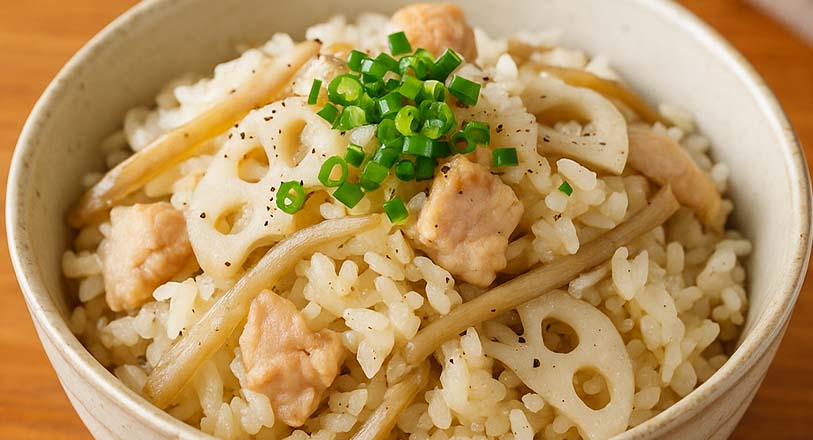 れんこんとごぼうのシャキシャキとした食感が楽しく、鶏肉のうま味と黒こしょうの香りがアクセントになった一品です。和の食材を洋風に仕上げた混ぜご飯は、普段の食卓にもぴったり。具材を炒めて混ぜるだけで簡単にできるのもうれしいポイントです。