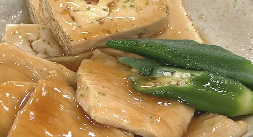 だしの旨みとしょうゆの香ばしさが染みた豆腐と、やわらかい鶏肉が絶品です。片栗粉でとろみがついたつゆが全体を包み込み、上品で深みのある味わいに仕上がっています。オクラと青ゆずが彩りと香りのアクセントになり、見た目にも美しい一品です。