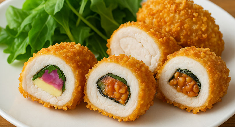 2種類の具材をはさんだささ身は、外はカリッと香ばしく、中はジューシーで風味豊かでした。しば漬けとチーズの組み合わせはさっぱりとした酸味とコクが楽しめ、キムチ納豆はパンチのある味わいでご飯にもぴったりです。お弁当のおかずやおつまみにも活躍しそうな一品でした。