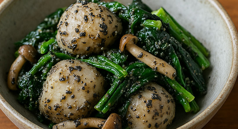 ホクホクの里芋とシャキッとしたほうれんそう、しめじのうま味が黒ごまの香ばしさに包まれて、和の味わいが楽しめる一品です。ごまの風味がしっかりと効いていて、ごはんのおかずやお弁当の副菜にもぴったり。電子レンジを活用するので手軽に作れるのもうれしいポイントです。